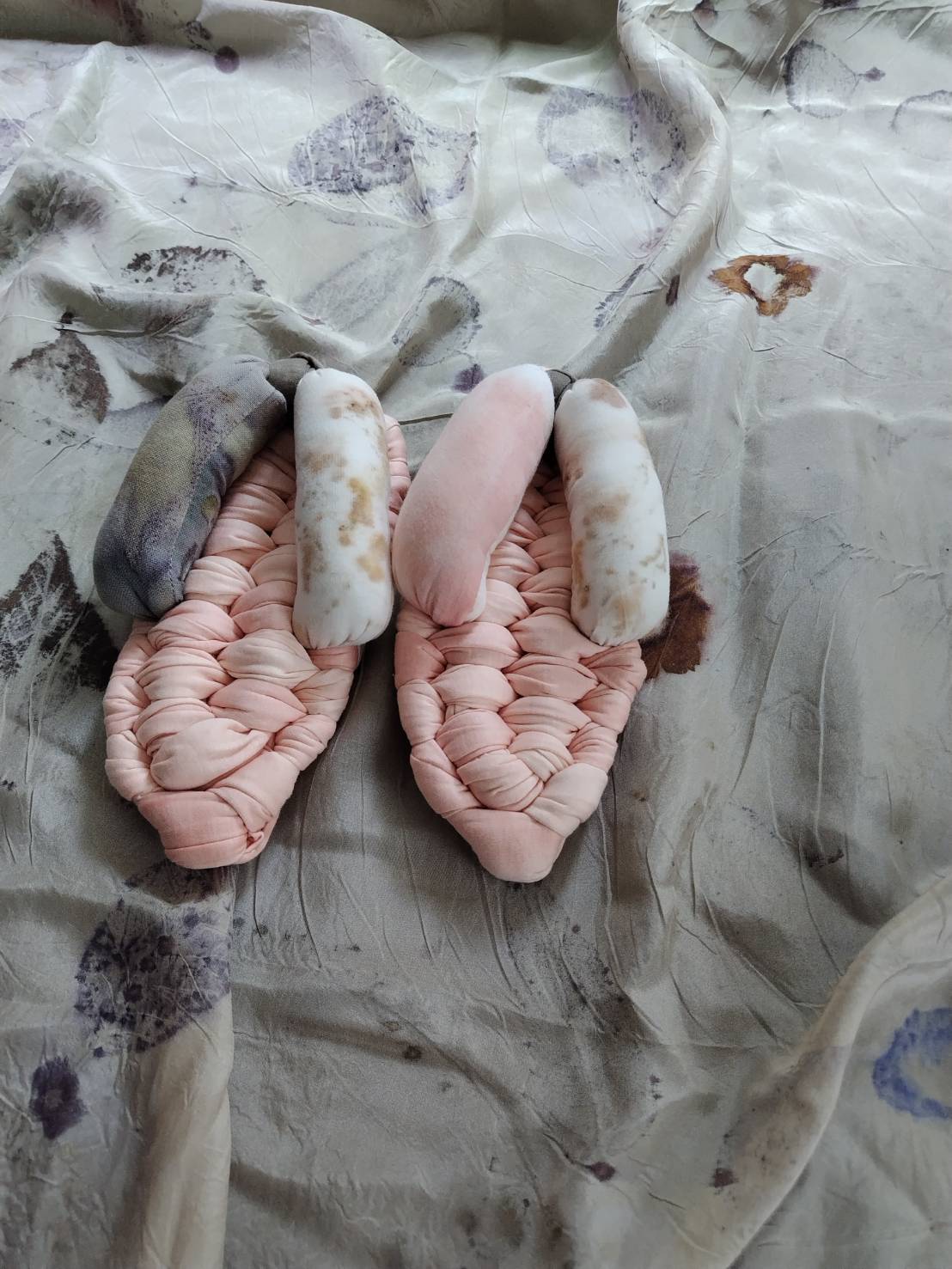 草木染の茜がもつ、血やいのちを思わせるあたたかな色を、布草履として丁寧に編み込みました。